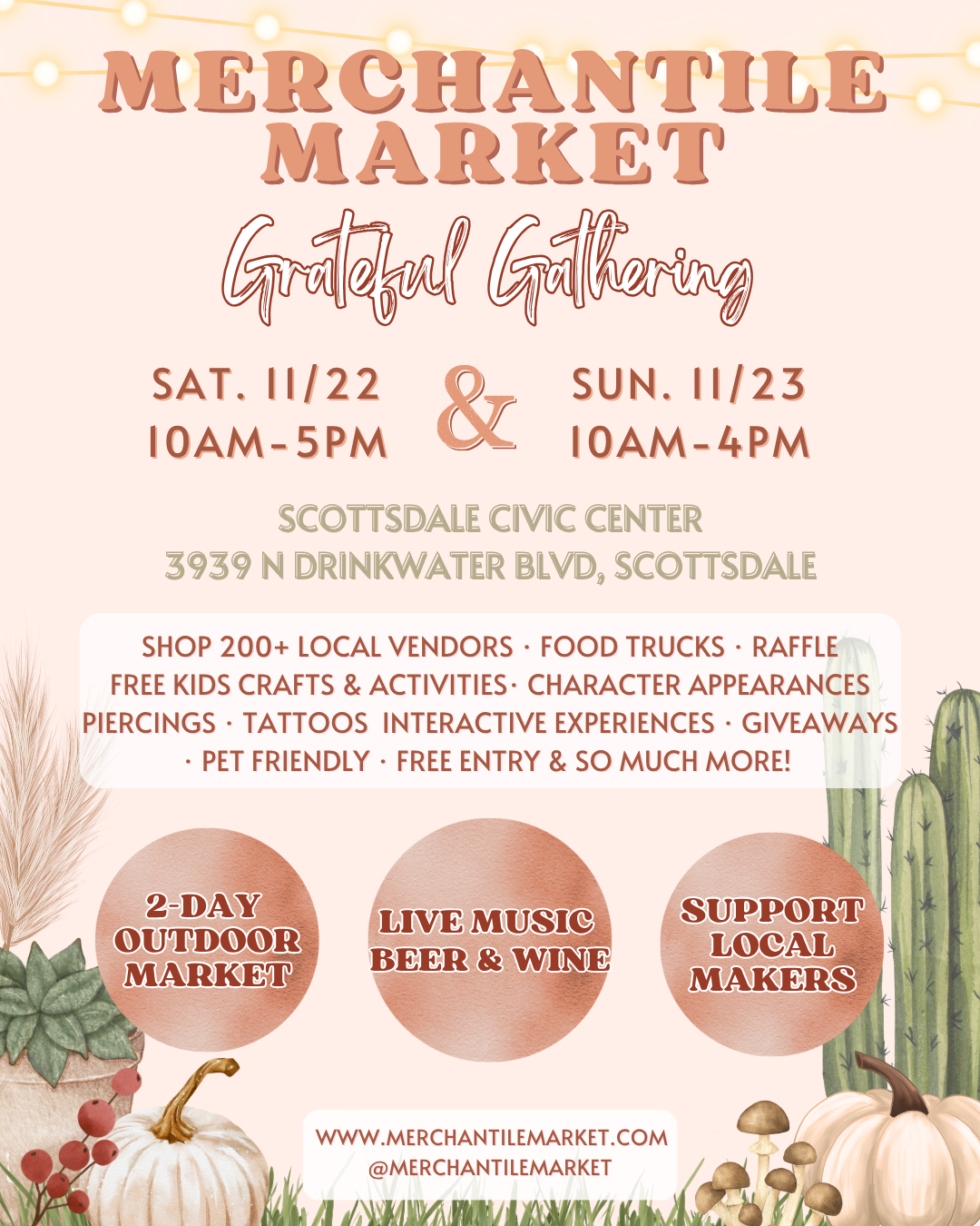 You’re invited to join us for our first 2-day market happening on Saturday, Nov. 22nd from 10am-5pm and Sunday, Nov. 23rd from 10am-4pm at Scottsdale Civic Center, for Merchantile Market’s “Grateful Gathering”! ✨Come experience:-200+ vendors-Specialty Food & Drinks-Beer & Cocktails -Live Musicians-FREE Kids Crafts-Character Appearances-Wood Games Station-Piercings & Tattoos-Permanent Jewelry, Custom Engraving & Charm Bars-Hat Bars, Boot Bars & Embroidered Apparel-DIY Christmas Ornament Bar-Perfume Bar-Photo-op Backdrop🎉 PLUS we’re having awesome giveaways! We’re giving away FREE market totes to the first 100 people in line at the welcome booth on both days, a raffle basket filled with vendor goodies, and a $100 cash giveaway (Saturday only) to shop till you drop at the market!We’re also proud to be partnering with Hope Women’s Center for a toy drive! Kindly drop off a gift at our info booth & receive an extra ticket for our raffle basket!We can’t wait to see you there!! ❤️📍Scottsdale Civic Center: 3939 N Drinkwater Blvd. Scottsdale, AZ.Sponsored by @plushlaser and @renewalbyandersen FREE ENTRY - FREE PARKING - PET FRIENDLYFollow @merchantilemarket for updates! Visit merchantilemarket.com for details!