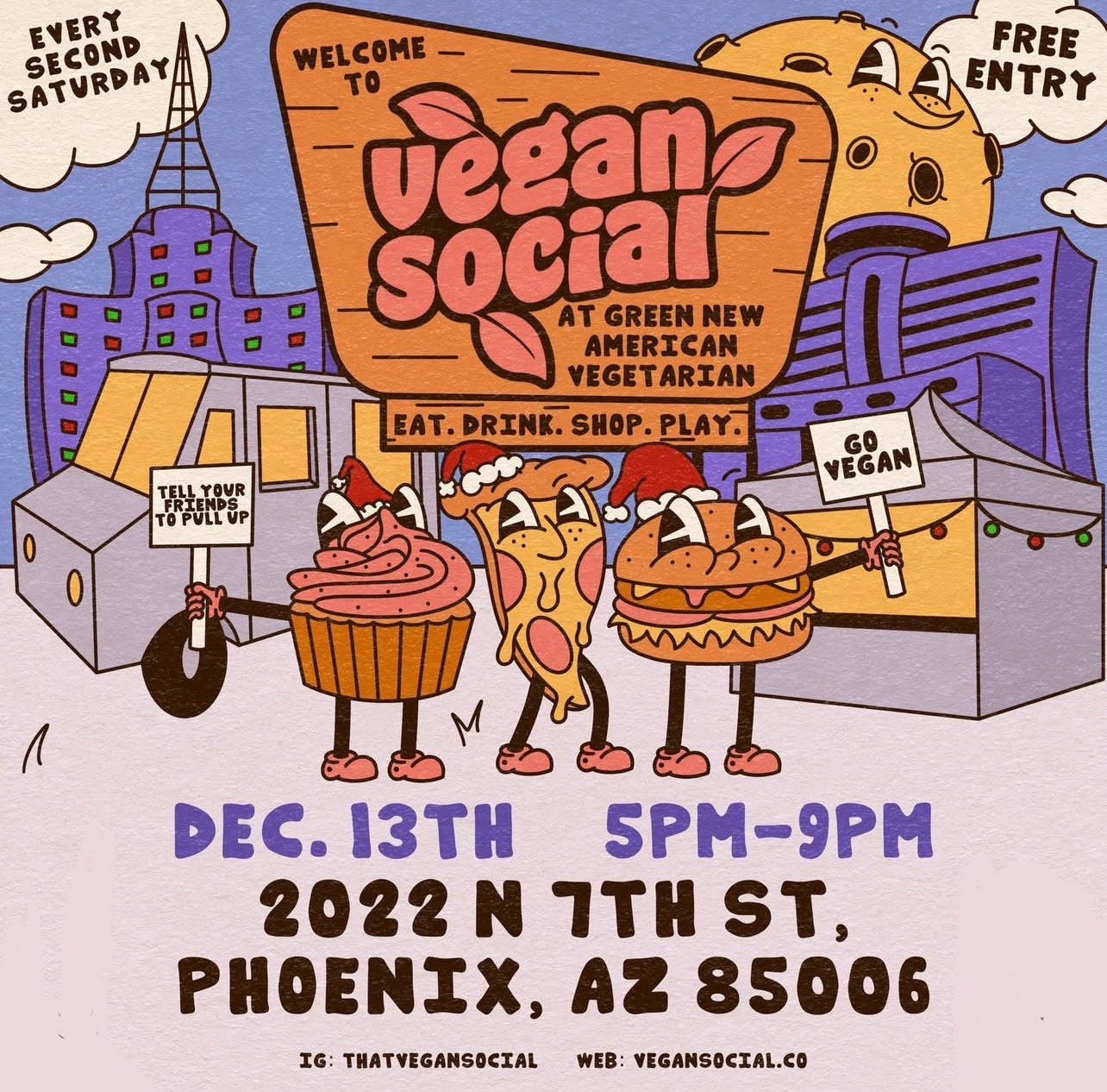 Mark your calendars for Vegan Social happening at @greenrestaurantaz X@namivegansweets parking lot in Phoenix, AZ... on December 13th, 2025 ott 7th St & Palm Ln (2022N 7th St, Phoenix, AZ 85006) from 5PM-9PM!Come meet new peeps, eat amazing vegan food, drink, dance, and shop the night away at the Vegan Social from 5PM-9PM in Central Phoenix.9 2022 N 7th St, Phoenix, AZ 85006TELL YOUR FRIENDS TO PULL UP! Go Vegan